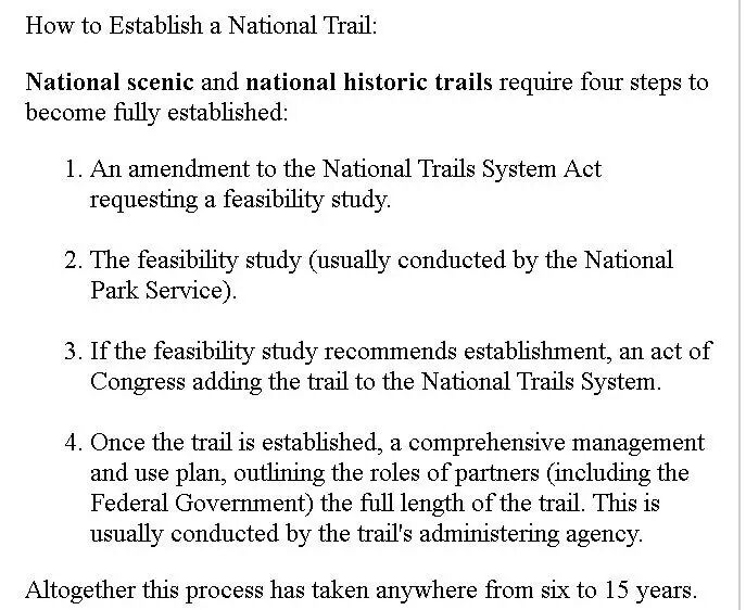 国家步道体系是由1968年的《国家步道法案》设立的。只要一看到“法案”二字,大家就应该知道,这是美国三权分立体系中的立法分支,由国会处理。也就是说,总统和它的行政部门的权力,相对较小。